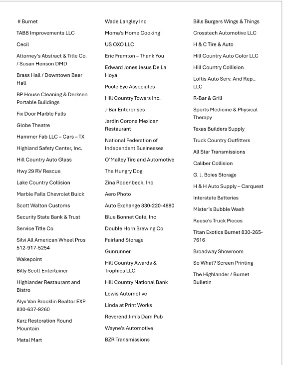 - Weekly Breakfast: A group of early risers meets every Wednesday for breakfast at The Trailblazers (216 South Main Street, Burnet, Texas).