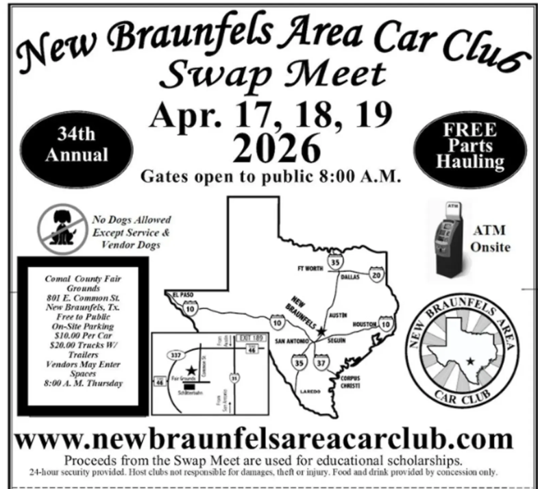 New Braunfels Area Car Show & SWAP Meet SWAP Meet on April 17, 18, & 19 Date Apr 17 - 19 2026 Expired! Location Comal County Fairgrounds Category Car Events Next Event Looking For Some Car Activities Date May 01 2026